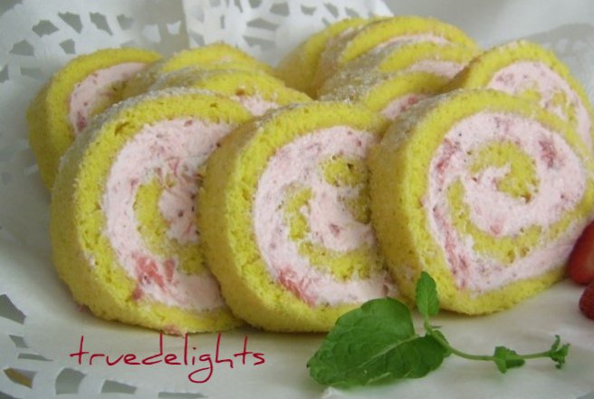 Se desface rulada, se intinde spuma de capsuni si se ruleaza cu ajutorul prosopului. Pe masura ce se ruleaza se desface si hartia de copt. Se poate pudra cu zahar farin. Se lasa la rece pana in momentul servirii.