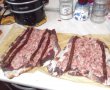 N-am sa povestesc cum am tinut carnea la saramura, am afumat-o, cum am facut carnati si umplutura de sarmale, nu de alta, dar sigur va plictisiti si o sa ziceti unde sa tai eu porc, de unde saramura, de unde afumatoare si altele, asa ca ma limitez la a prezenta cum am asamblat eu aceasta rulada. Bucata de carne afumata am taiat-o in doua bucati, in partea mai groasa am taiat in asa fel incat sa obtin o bucata mai subtirica sa o pot rula.