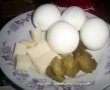 Pe o folie de aluminiu intindem amestecul de carne tocata, asezam ouale, cascavalul si castravetii murati, rulam strans si punem carnea (fara folie!) intr-o tava unsa cu ulei.