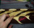Albusurile se bat spuma apoi se pune zaharul si se mai bate putin dupa care se pune faina.Se imparte compozitia in 2 iar intr-una se pune cacao,apoi se pun in pungi separate si se taie coltul.Se unge o tava cu putin unt apoi se pune pe diagonala un rand maro si unu alb si se pune la copt la 160 grade 20-25 minute