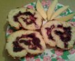 Dupa ce s-a copt (eu am tinut-o exact 20 minute, dar depinde de cuptor) o rulam intr-un prosop si o lasam 5-10 minute rulata, apoi vom intinde din nou si acoperim cu gem toata suprafata. Rulam strans si asezam pe un platou. Se poate pudra sau se va servi asa. Eu nu am vrut sa stric modelul :))