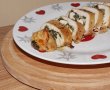 Daca aveti un piept de pui intreg il taiati in doua. Fiecare jumatate se taie in doua pe lungime, dar nu de tot, obtinand astfel cate o felie mai mare de piept de pui. Acoperim fiecare felie in parte de piept de pui si o batem usor, sa nu zdrobim carnea, cu batatorul de snitele. Se condimenteaza fiecare bucata cu sare si piper, se stropeste cu putin ulei de masline, se freaca bucatile si se lasa la temperatura camerei pentru 10 minute.