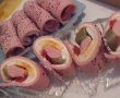 • - peste felia de sunca se aseaza felia de branza topita, iar pe mijlocul feliei se pun, una langa alta, oul, castravetele, gogosarul si cremvrustiul, dupa care se releaza cat se poate de strans