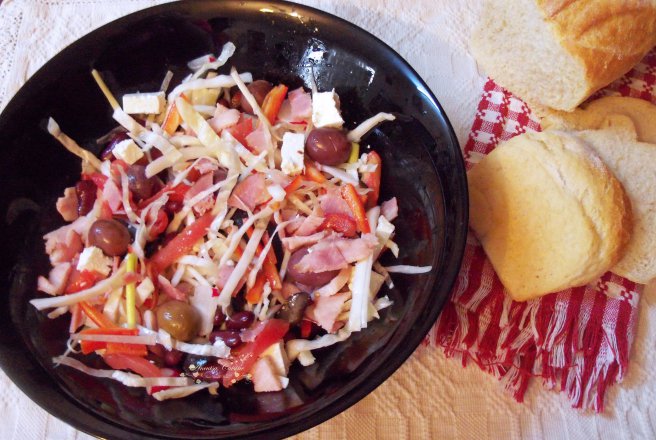 Îmi plac mult salatele şi îmi place să experimentez tot felul de ingrediente. Aceasta este cu fasole roşie, varză albă, măsline, roşie, ardei kapia, ridichi, praz, piept de porc afumatşi brânză. Alături de pâine turist sau o pâine ţărănească este foarte gustoasă şi săţioasă şi vă va da energie în aceste zile de iarnă.