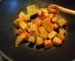In tigaie punem dovleacul si il lasam sa se incalzeasca si sa absoarba grasimea lasata de bacon, aromata acum cu usturoiul.
