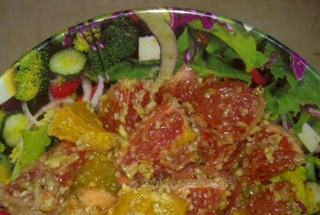 Portocala si grepfruitul se curata de coaja si se taie cubulete. Se stropesc apoi cu sirop de artar si se presara deasupra nuci macinate.