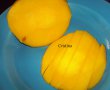 Salata de fructe: Pepenele galben trebuie sa aiba miezul portocaliu si a cantarit 1,115 kg, dar nu l-am pus pe tot. Se spala, se taie felii, se curata de seminte si se taie cubulete. La fel se procedeaza si cu celelate fructe. Vedeti cum taiati mango, pentru ca are un sambure mare plat. Trebuie taiate pe langa el, doua jumatati de fruct si apoi decupati restul. Se amesteca salata cu doua linguri, usor.