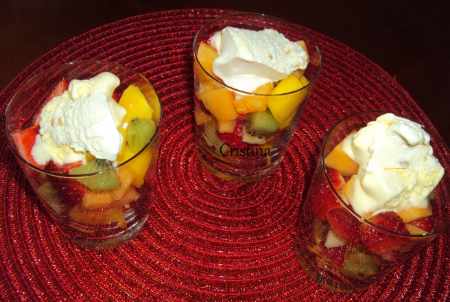 Siropul ( eu nu am facut): Fructul pasiunii se taie in jumatati si luati semintele. Treceti (semintele) printr-o sita si apasati pentru a extrage toata zeama. Sucul rezultat se amesteca cu miere, coaja si zeama de lime. Se strecoara din nou si se toarna peste salata. In mod normal, se tine la frigider 1 ora cu sirop, dar se poate consuma imediat.