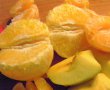 Taiati cubulete gutuile, piersicile, merele, portocalele si mandarinele. Se adauga toate fructele taiate anterior in bol. Se pun strugurii, ciresele confiate si bobitele de rodie.