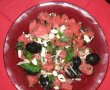 Intr-un vas mare, se amesteca bucatile de pepene rosu, branza feta faramitata, maslinele negre, ceapa cu zeama de lamaie si menta. In final, se stropeste uleiul de masline peste toata compozitia si se amesteca bine. Se serveste imediat.