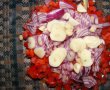 Între timp, tocăm mărunt ardeiul şi ceapa, pe care le punem în bolul de salată. Dacă preferaţi şi usturoi în salată tocaţi-l mărunt si puneţi-l peste legume.