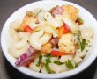 Fierbem pastele conform instrucţiunilor de pe ambalaj. După timpul de fierbere le scurgem şi le clătim sub jet de apă rece. Le adaugăm în bol (bine scurse de apă).