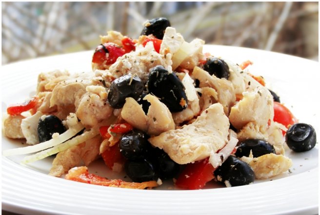 Bucatelele de pui se pun in tigaia incinsa si se prajesc 10-15 min, pana devin rumene. In rastimpul asta, ceapa o tai solzisori, ardeii copti ii cureti de samburi sii ii tai cubulete, la fel si ardeiul gras si branza. Rosiile le tai pe din doua. Cand carnea e facuta, o lasi sa se raceasca, apoi pui toate ingredientele intr-un bol si amesteci. Condimentezi dupa gust. Eu n-am mai simtit nevoia decat de foarte putina sare (branza si maslinele erau oricum sarate) si nici de otet, fiindca se simtea numai cat trebuie cel de la ardeii copti, dar am pus busuioc, ador busuiocul! Servesti cu paine prajita. Pofta buna!