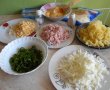 Am făcut această salată, la care mă gândeam de mult timp, în urmă cu vreo trei-patru săptămâni, dar am amânat postarea rețetei, pentru că mai era atunci pe site una similară și n-am vrut să pară că ar fi un gest concurent. De fapt, sunt multe rețete de salată Mimoza, cu straturi și ingrediente diferite și fiecare o face pe aceea care-i place. Eu am ales să fac această salată cu șuncă și mozzarella/cașcaval. În plus, am adăugat un strat de salată verde și pe lângă maioneză, am folosit și cremă de brânză.