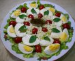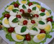 De jur împrejurul dressing-ului se pun feliile de mozzarella, roșiile cherry și apoi feliile de ouă.