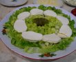 Se pune salata tăiată fideluță în platou, la baza salatei și în mijloc se face loc pentru recipientul cu dressing-ul.