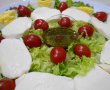 Se presară mozzarella răzuită în mijlocul salatei, de jur împrejurul recipientului cu dressing-ul și se decorează feliile de mozzarella cu frunze proaspete de oregano.