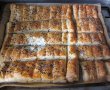 Foietajul dezghetat, se taie fasii, se unge cu ou batut, se presara cascaval ras deasupra, se presara sare iodata si seminte de in. Se introduce tava in cuptorul preincins, cca. 15 minute la foc puternic, aproximativ 250 g.