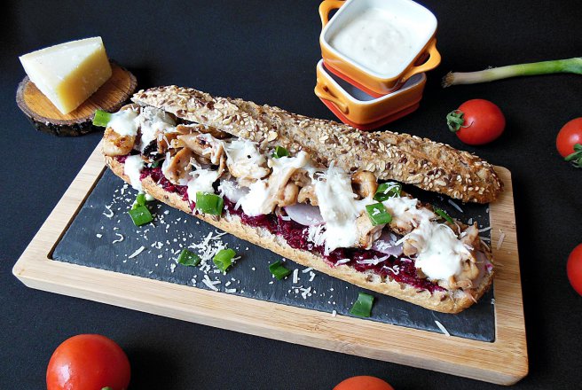 Sosul: Amestecati intr-un bol iaurtul, mustarul, ierburile aromatice si parmezanul ras. Adaugati sare si piper la sos, dupa gust. Sfecla o dati pe razatoarea mica. O amestecati cu uleiul, otetul balsamic si putina sare. Ridichiile le curatati de coaja, le taiati felii. Foile de ceapa verde le taiati rondele. Taiati partea de deasupra la cele doua mini baghete. Pe fiecare mini bagheta puneti sfecla, felii de ridichii, bucati de pui, apoi sos. Deasupra presarati ceapa verde si parmezan ras. Acum il puteti servi!