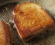 Cand ambele parti s-au rumenit , asezam pe doua din feliile de paine, branza topita si suprapunem cu celelalte doua felii de paine .