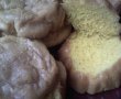 Scoatem savarinele cu tot cu folie din tava si le lasam 5 minute sa se raceasca.Dupa le dam jos folia si le insiropam.Le intoarcem invers cu partea lata in jos si ii taiem partea de sus forma unui capacel de 1 cm(dar nu-l taiem de tot).