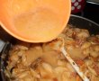 Separat calim salamul, ceapa, taiate fidelute, adaugam ciupercile, sosul de bulion cu masline, cascavalul ras.