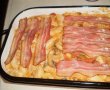 Dupa ce au fiert pastele le strecuram si le adaugam in tigaie peste compozitia facuta, amestecam sa se omogenizeze. Punem ouale batute cu putina sare si piper, ungem o tava cu putin ulei, adaugam pastele, deasupra punem baconul si dam la cuptor 10 minute.