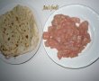 Puiul l-am taiat bucatele si l-am prajit in putin ulei asezonand cu sare, piper si boia de ardei dulce. Am prajit cartofii , am facut maioneza si am taiat felii de castravete murat.