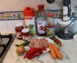 In robot tocam bine ceapa, morcovul, usturoiul si ardeiul. Intr-o cratita punem aceasta compzitie la calit cu ulei de masline si adaugam carnea. Amestecam bine cca 3-5 minute si adaugam sare, piper, boia de ardei, rozmarin, dafin si turnam vinul. Lasam putin sa scada si adaugam pasta de ardei, de rosii si bulionul. La nevoie mai adaugam apa fierbinte. Lasam sa fiarba cca 15-20 minute pana se ingroasa sosul. Eu am adaugat putina faina sa ingroase si mai tare sosul. Lasam sa se raceasca putin