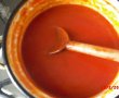 Se ia o cratita mai mica; se pune pasta de tomate, zaharul, sarea si piperul si se amesteca bine. Se pune apoi uleiul si se amesteca bine; apoi pui apa si amesteci bine. Daca vrei, mai poti pune faina (si amesteci cu telu) si atunci sosul iese un pic mai gros (in timp ce fierbe un pic, faina se ingroasa).