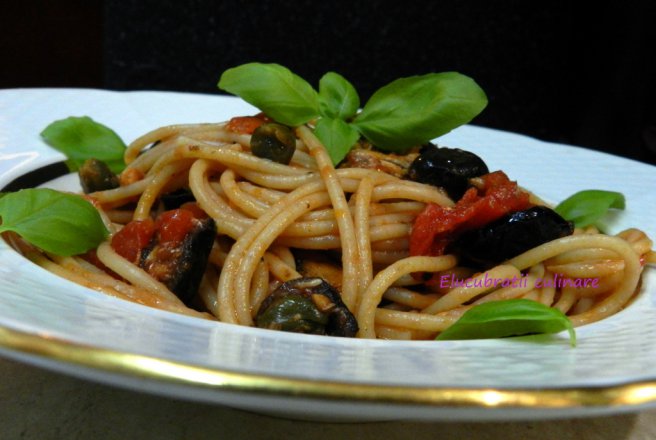 Se adaugă roșiile tocate cu tot cu sos, caperele, măslinele, oregano și ardeiul iute. Se lasă să fiarbă totul pentru 5 minute. Se condimentează cu sare, piper și pătrunjel.