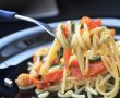 Cat rosiile sunt in cuptor, fierbieti spaghetele conform instructiunilor de pe ambalaj,apoi le scurgeti de apa si le dati la un jet de apa rece.