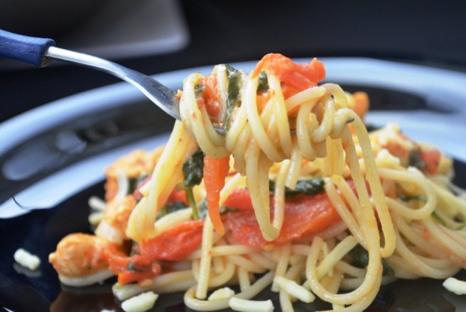 Intr-o tigaie mai mare,in uleiul incins caliti usturoiul taiat marunt 1 minut,apoi adaugati carnea de pui taiata cubulete mici si condimentata cu sare, piper si pasta de ardei. Cand carnea isi schimba culoarea si textura,adaugati spanacul(spalat cu apa rece si scurs) si rosiile coapte. Amestecati usor toate ingredientele,iar dupa 1 minut adaugati spaghetele si mai lasati la foc mic 3 minute. Daca mai este necesar condimentati dupa gust cu sare si piper.