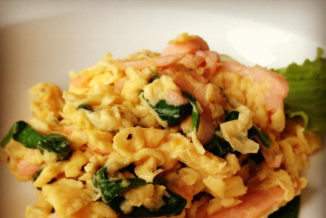Ouăle se bat cu puțin piper și se toarnă într-o tigaie cu puțin ulei de măsline încălzit la foc mediu spre mic. Se lasă câteva secunde până când baza începe să devină fermă. Se adaugă somonul și ceapa, iar cu ajutorul unei spatule se învelește somonul în ou, amestecând ușor. Se adaugă spanacul și se mai gătește până când acesta s-a înmuiat.