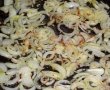 Ceapa curatata, spalata si taiata solzisori se prajeste usor in ulei (sau unt). Adaugam bucatile de peste pregatite din timp si sarate ( eu am fript pestele usor, inainte de a-l pune in cratita cu ceapa calita ) . Lasam sa se patrunda usor pestele, apoi transferam totul intr-un alt vas termorzistent.