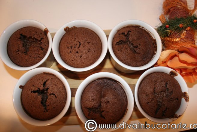 Apoi punem smantana intr-o cratita si adaugam sucul si coaja de portocala. Le lasam sa dea in clocot. Noi amestecam in timpul acesta compozitia. Dupa ce a dat in clocot, dam cratita la o parte de pe foc si adaugam ciocolata rasa. Amestecam bine, pana se topeste ciocolata.Adaugam apoi zaharul si mai amestecam putin. Integram in compozitie galbenusurile. Adaugam apoi albusurile batute spuma si amestecam usor. Turnam in forme si punem la congelator pana in momentul in care vrem sa coacem sufleurile – poate sta la congelator si cateva zile.Sufleul il bagam in cuptor direct din congelator. Coacem timp de 20 de minute la 180°C. Yammy!!