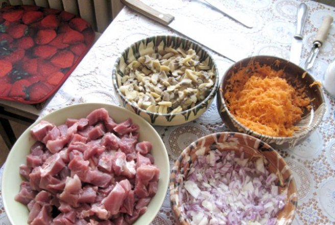 Se taie ceapa marunt, iar morcovii se dau prin razatoarea mica. Carnea se spala si se taie in cubulete potrivite.