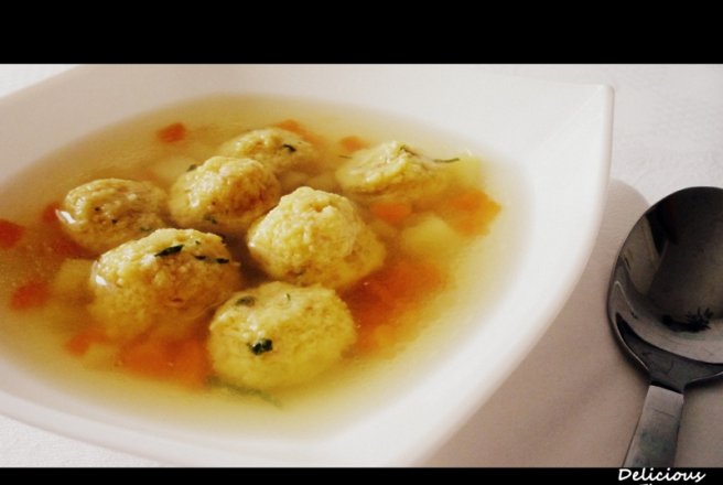 Cand incepe sa fiarba supa, pregatim perisoarele. Punem sunca intr-un blender cu cutit si tocam marunt (sau dam prin masina de tocat carne). Cartoful fiert si racit il zdrobim ca pentru piure, adaugam sunca, oul, faina, pesmetul, putin leustean tocat marunt, sare si piper dupa gust si amestecam bine pana obtinem o compozitie omogena usor de modelat. Formam bilute, iar cand legumele din supa sunt fierte, adaugam perisoarele si lasam sa fiarba la foc mic pana se ridica la suprafata.