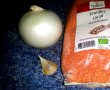Taiati ceapa marunt. Incalzim uleiul de masline,prajiti ceapa, adaugati usturoiul tocat si lintea rosie.