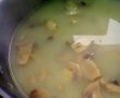 Se spala ciupercile si se feliaza, dupa care, circa 350 g dintre ele se adauga peste ceapa si se calesc, amestecand constant pana cand se evapora apa pe care acestea o lasa. Se adauga faina si se amesteca bine pana cand se imbraca toate ciupercile in faina (eu am procedat asa cum era scris in reteta pe care am gasit-o pe internet, dar va recomand sa amestecati faina separat cu putina apa rece si apoi sa o puneti peste ciuperci, pentru ca, asa cum am procedat eu, s-au format si cateva cocoloase). Se toarna apa fierbinte si se amesteca totul. Se fierbe supa circa 15 minute sau pana cand se inmoaie bine ciupercile.