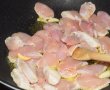 Am pus pastele la fiert in apa cu sare. Am folosit tagliatelle in doua culori, albe si verzi. Pieptul de pui spalat bine si uscat, l-am taiat cubulete, apoi fasii mai subtiri.