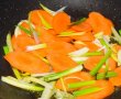 In uleiul ramas in wok am pus ceapa si morcovul la calit, pret de 2 minute, am adaugat carnea peste si am condimentat cu sare.