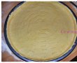 Prima foaie o intindem si o asezam in tava tapetata cu margarina si faina. Turnam apoi umplutura de visine.