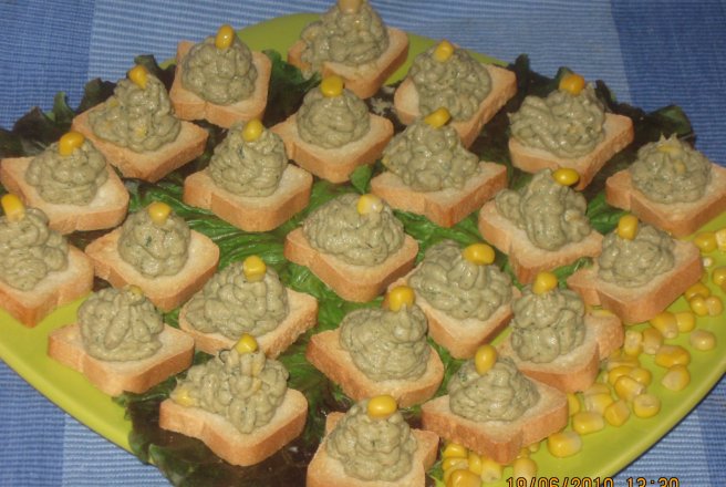 Punem fileurile de macrou intr-un vas mai inalt.Stoarcem zeama de lamaie(dupa gust),adaugam ceapa si mararul taiate marunt si mixam cu blenderul vertical pana cand obtinem o crema.Condimentam cu sare si piper si adaugam boabele de porumb din conserva spalate sub jet de apa si apoi scurse.Amestecam bine pentru o buna omogenizare.Dam la rece circa 30 min. dupa care scoatem din frigider si spritam pe feliile de mini-toast pasta de peste.