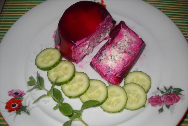 Sfecla curatata de coaja se pune la fiert(trebuie sa fie moale);intre timp,se captuseste bolurile cu folie alimentara si branza amestecata cu menta si ceapa taiata foarte marunt;dupa ce a fiert sfecla,se taie felii subtiri,si se pune in fundul bolului si pe margini;pe mijloc se pune branza,se niveleaza suprafata,se pune o rondea de sfecla si se aduna folia;se dau la frigider cateva ore pana la servire;se descopera bolul,se rastoarna pe farfurie,apoi se ia folia;se serveste cu rondele de castraveti