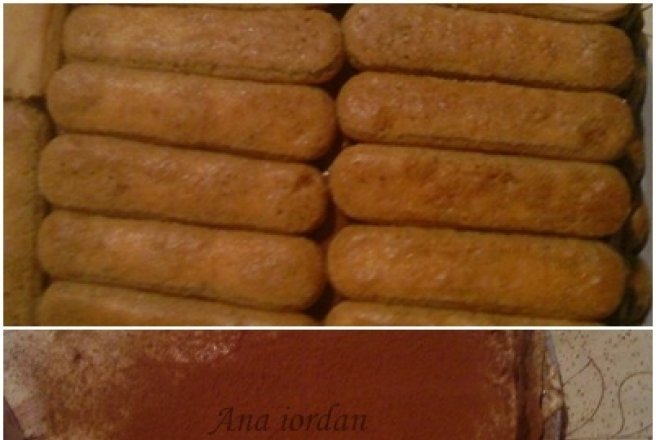 Dupa ce cremele s-au facut se trece la asamblarea prajiturii. Piscoturile se inmoaie putin in cafea, 2 secunde..nu se tin mult pentru ca altfel se vor inmuia prea tare. Si se aseaza pa platou pana se reazlizeaza un strat de piscoturi, apoi se pune un strat de crema de ciocolata, apoi iar un rand de piscoturi, ar trebui sa aveti trei randuri de piscoturi si doua de ciocolata...dupa ce puneti la treilea rand de piscoturi ultimul rand de crema, al treilea, va fi de crema de tiramisu. Se pudreaza cu cacao si se da la frigider cel putin 4-5 ore pentru a se intari crema, cel mai bine e sa fie lasat de seara pentru a doua zi.