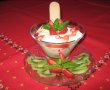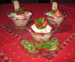 In cupe se aseaza mai intai piscoturi inmuiate in zeama de la fructe( se pun fructele intr-o strecuratoare sa se scurga plusul de lichid care rezulta). Se pun straturi alternative de crema de branza, fructe,sirop; ultimul strat este de crema de branza. Se decoreaza cu felii de capsuni , seminte de rodie , frunze de menta verde si sirop. Se pun la frigider 2 ore .