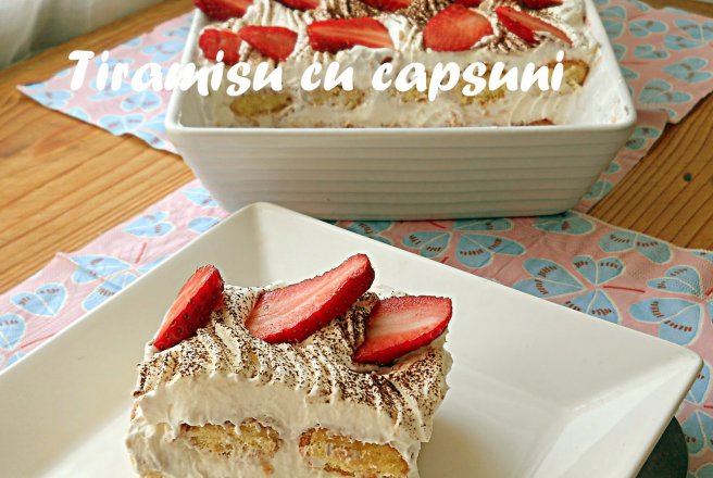 (Pentru ca atunci cand am postat aceasta reteta am fost cascata sau prea adormita :D din greseala am postat-o la articole si Bucatarasul Sef m-a atentionat si m-a rugat sa o postez din nou, iata ca acum m-am conformat.) Din nou tiramisu, pentru ca dupa cum spuneam intr-o postare anterioara, este un desert foarte simplu si rapid. Pentru ca lui Alex nu ii place varianta clasica de tiramisu (din cauza cafelei), de aceasta data am facut un tiramisu cu capsuni. Pentru ca zilele trecute am facut curatenie prin congelator si am gasit o punga cu capsuni, am folosit capsunele congelate pentru a face un sos pentru insiropat piscoturile. A iesit un desert delicios, Alex chiar mi-a zis sa nu mai fac niciodata tiramisu cu cafea ci doar cu capsuni. :)