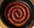 Aranjam carnatul in forma de spirala, il punem intr-o tava rotunda unsa cu putin ulei si punem la cuptor, la 220 grade C, pentru 20 minute (sau pana cand este bine copt) .Intoarceti in timpul coacerii, carnatul de pe o parte pe cealalta.