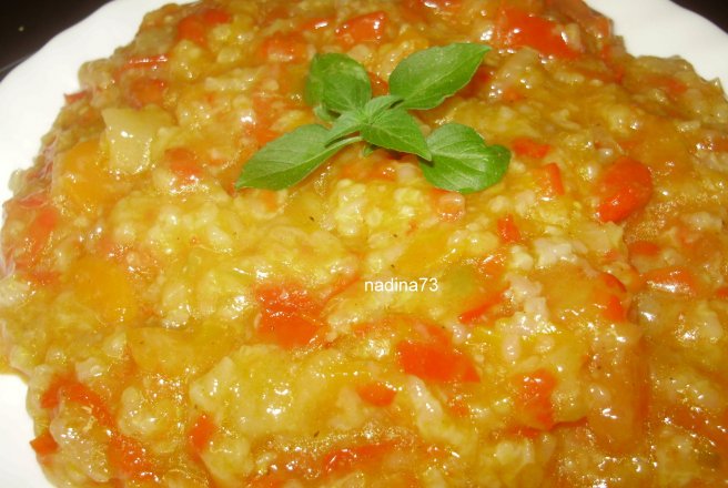 Se amesteca ardeiul,ceapa,morcovul si orezul , se pun toate la calit cu uleiul ,sare ,foile de dafin,piper si foile de dafin,se fierb la foc potrivit amestecand din cand in cand.Bulionul sau pasta de tomate se pune spre sfarsit ,dupa care se mai fierbe 1/2 ora ,tot atunci se pune si zaharul